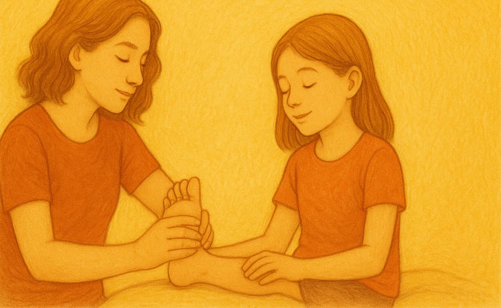 Tijdens de massage hoeft het kind alleen de sokken en schoenen uit te hebben. Alleen voet, hand en hoofd worden gemasseerd.